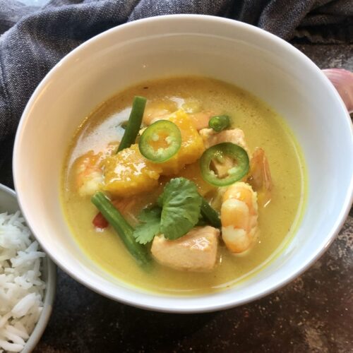 This Thai pumpkin seafood soup brings the heat and spice of Asia to your dinner table, so you can dream away to foreign lands and feel cozy despite the weather outside. Use any type of pumpkin and substitute the salmon and raw prawns for any meaty white fish if you prefer.